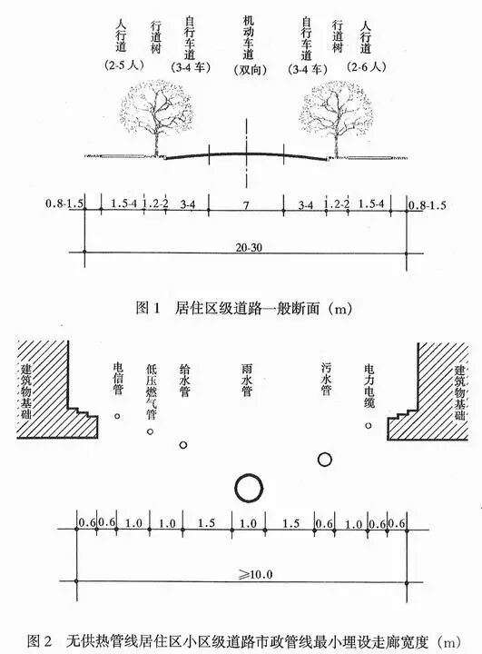 小区级道路车行道的最小宽度为6m,如两侧各安排一条宽度为1.5m的人行路,总宽度为9m,即可满足一般功能需要。同时,小区级道路往往又是市政管线埋没的通道,在无供热管线的居住区内,按六种基本管线的最小水平间距,它们在建筑线之间的最小极限宽度约为10m(图2),此距离与小区级道路交通车行、人行所需宽度基本一致。