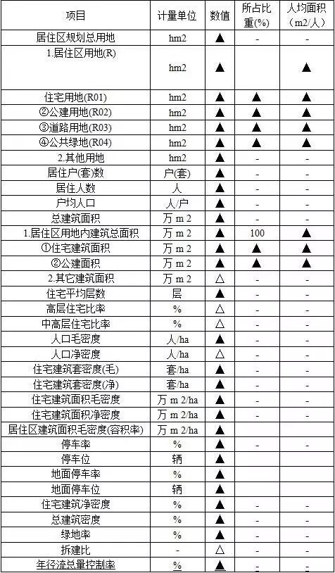 11.0.1 居住区综合技术经济指标的项目应包括必要指标和可选用指标两类,其项目及计量单位应符合表11.0.1规定。