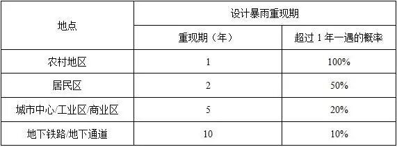 注:1表中所列设计重现期适用于采用年最大值法确定的暴雨强度公式。