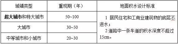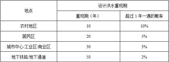 【条文说明】城镇内涝防治的主要目的是将降雨期间的地面积水控制在可接受的范围。鉴于我国还没有专门针对内涝防治的设计标准,本规范表3.2.4B列出了内涝防治设计重现期和积水深度标准,,用以规范和指导内涝防治设施的设计。