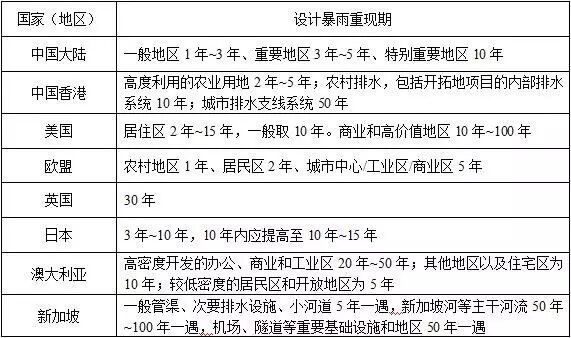 发达国家和地区的城市内涝防治系统包含雨水管渠、坡地、道路、河道和调蓄设施等所有雨水径流可能流经的地区。美国和澳大利亚的内涝防治设计重现期为100年或大于100年,英国为30年~100年,香港城市主干管为200年,郊区主排水渠为50年。