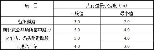 根据调查资料,我国城市道路中人行道宽度一般为2m~10m,商业街、火车站、长途汽车站附近路段人流密度大,携带的东西多,因此应比一般路段人行道宽。