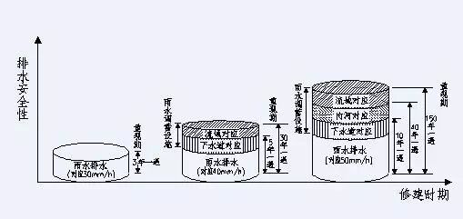 图1引自《日本下水道设计指南》(2001年版)中日本横滨市鹤见川地区的“不同设计重现期标准的综合应对措施”。图1反映了该地区从单一的城市排水管道排水系统到包含雨水管渠、内河和流域调蓄等综合应对措施在内的内涝防治系统的发展历程。当采用雨水调蓄设施中的排水管道调蓄应对措施时,该地区的设计重现期可达10年一遇,可排除50mm/h的降雨;当采用雨水调蓄设施和利用内河调蓄应对措施时,设计重现期可进一步提高到40年一遇;在此基础上再利用流域调蓄时,可应对150年一遇的降雨。