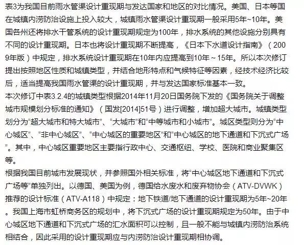 【条文说明】雨水管渠设计重现期,应根据汇水地区性质、城镇类型、地形特点和气候特征等因素,经技术经济比较后确定。原《室外排水设计规范》GB50014-2006(2011年版)中虽然将一般地区的雨水管渠设计重现期调整为1年~3年,但与发达国家相比较,我国设计标准仍偏低。