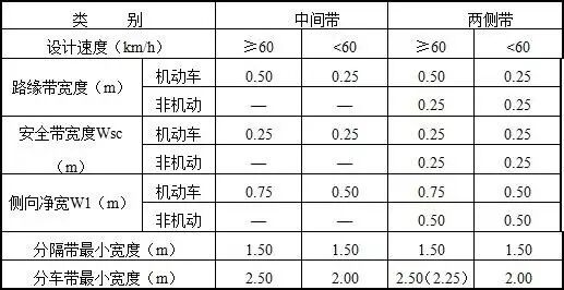 3 分隔带最小宽度值系按设施带宽度为1m考虑的,具体应用时,应根据设施带实际宽度确定。