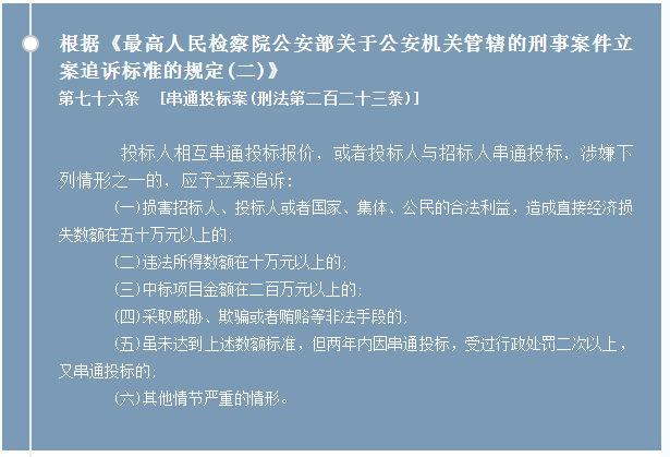 3、虽未达到上述数额标准,但因串通投标,受过行政处罚二次以上,又串通投标的。