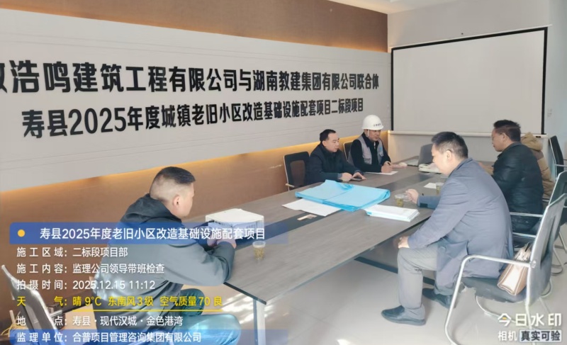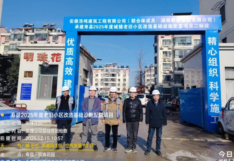12月15日,集团监理公司副总经理陆垣赤带队,质量安全中心副主任汪志华及检查组成员陈志平,前往公司监理的“寿县2025年度城镇老旧小区改造基础设施配套项目二标段”进行巡查,开展工程质量与安全生产管理的综合检查与指导。此次检查旨在强化监理履职,压紧压实各方责任,确保这项重点民生工程能够高质量、高标准、安全平稳地推进。