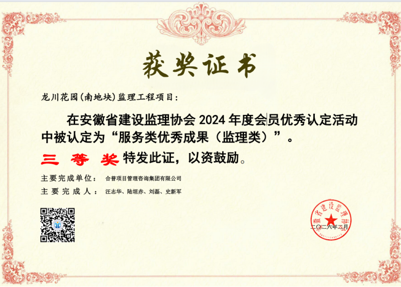在项目成果方面,由公司承担监理任务的“龙川花园(南地块)监理工程项目”荣获“服务类优秀成果(监理类)三等奖”。
