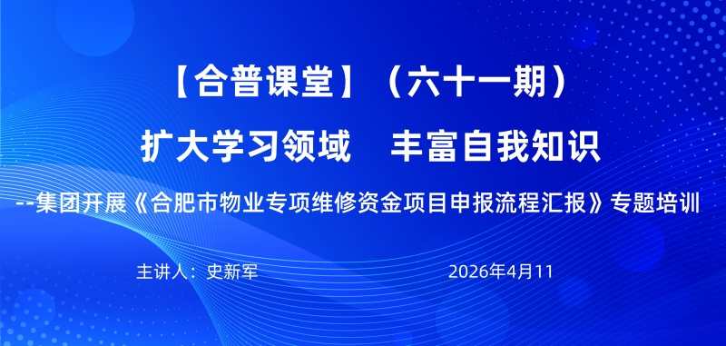 4月11日,合普课堂第61期在集团会议室如期举行。本期课堂由集团招标部经理史新军担任主讲,围绕2026年4月1日正式施行的《合肥市物业专项维修资金管理规定》,以“项目申报流程”为核心,为参训人员带来了一场政策解读与实操指导并重的专业培训。