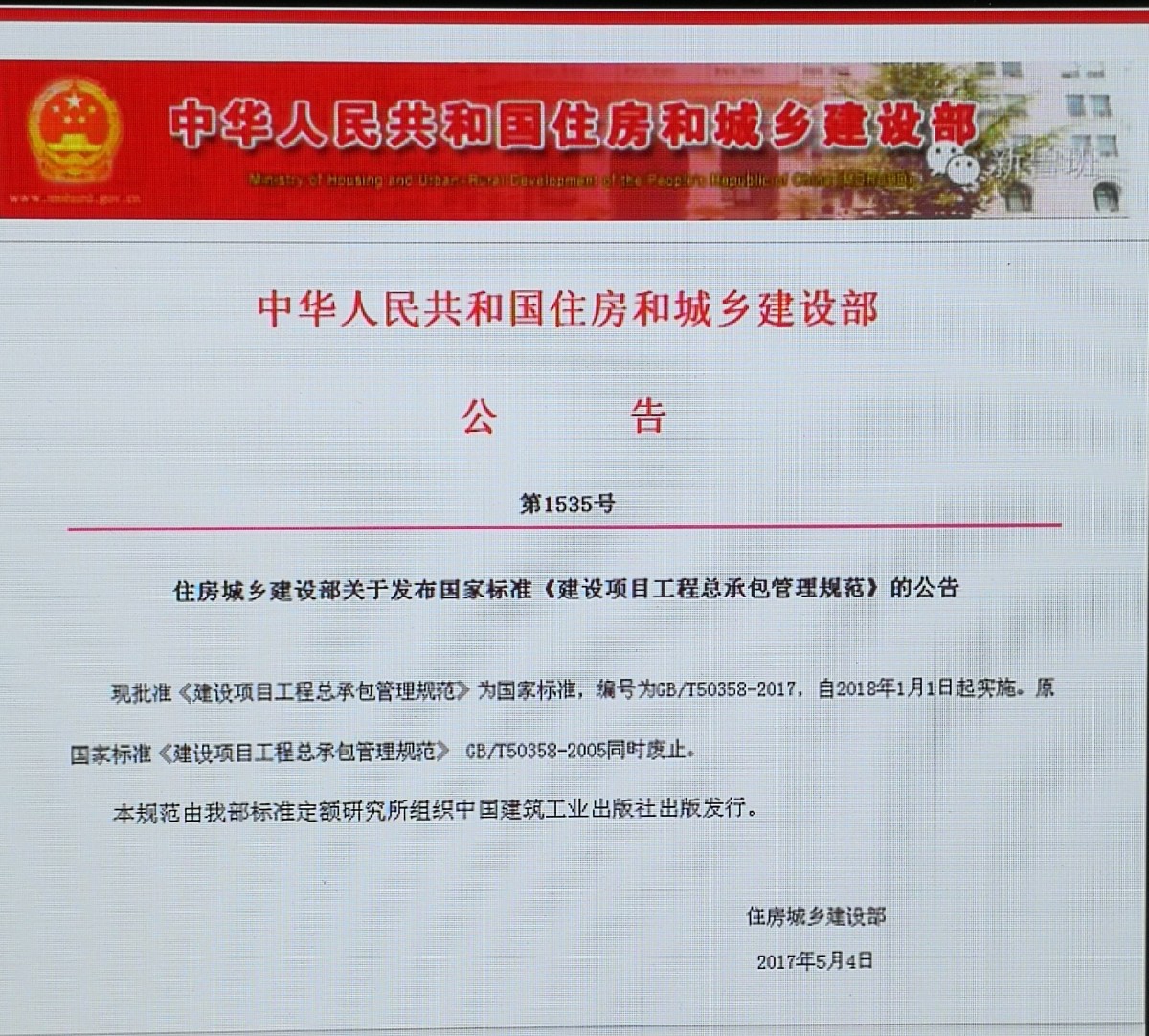 近日,住房和城乡建设部发布第1535号公告,批准《建设项目工程总承包管理规范》为国家标准,编号为GB/T50358-2017,自2018年1月1日起实施。出台有关的背景、重大内容的调整和补充以及问题解决的方法,工程建设相关各方需要深入了解
