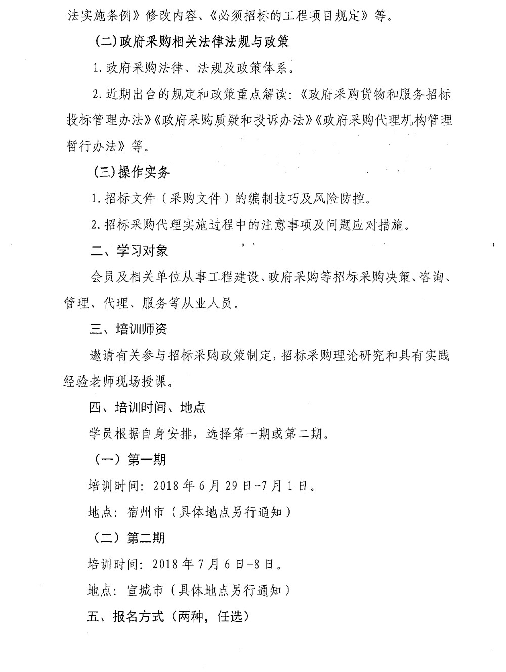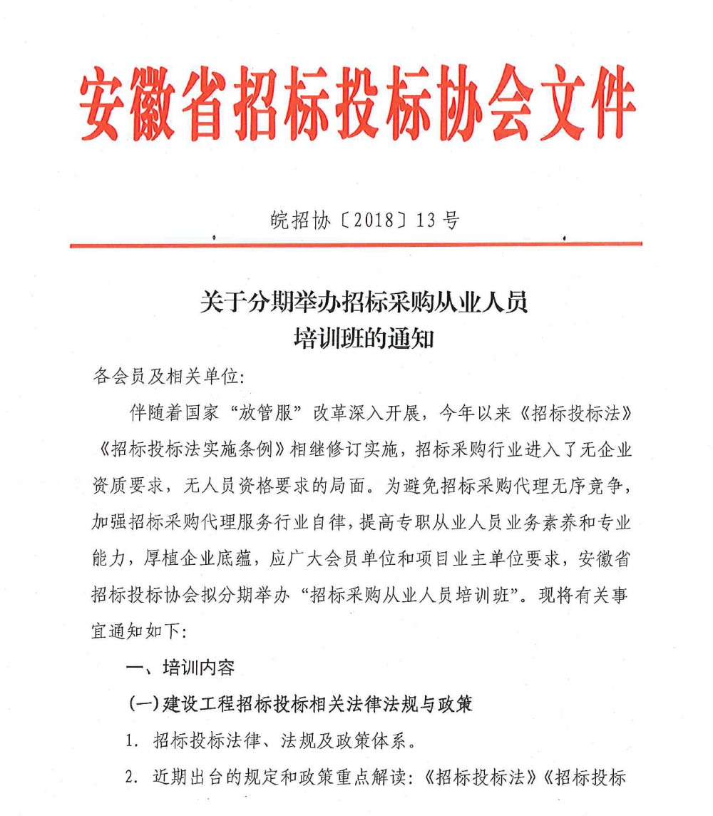 伴随着国家“放管服”改革深入开展,今年以来《招标投标法》《招标投标法实施条例》相继修订实施,招标采购行业进入了无企业资质要求,无人员资格要求的局面。为避免招标采购代理无序竞争,加强招标采购代理服务行业自律,提高专职从业人员业务素养和专业能力,厚植企业底蕴,应广大会员单位和项目业主单位要求,安徽省招标投标协会拟分期举办“招标采购从业人员培训班”。现将有关事宜通知如下: