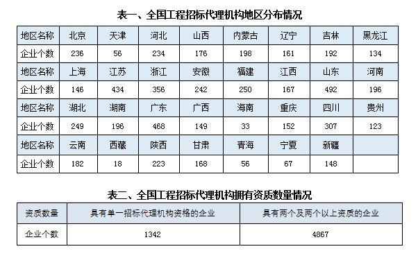 2017年度参加统计的全国工程招标代理机构共6209个,比上年下降4.4%。按照资格等级划分,甲级机构1938个,比上年下降0.97%;乙级机构2557个,比上年下降8.22%,暂定级机构1714个,比上年下降2.17%。按照企业登记注册类型划分,国有企业和国有独资公司共236个,股份有限公司和其他有限责任公司共3174个,私营企业2689个,港澳台投资企业3个,外商投资企业4个,其他企业103个。具体分布见表一、表二: