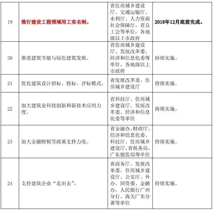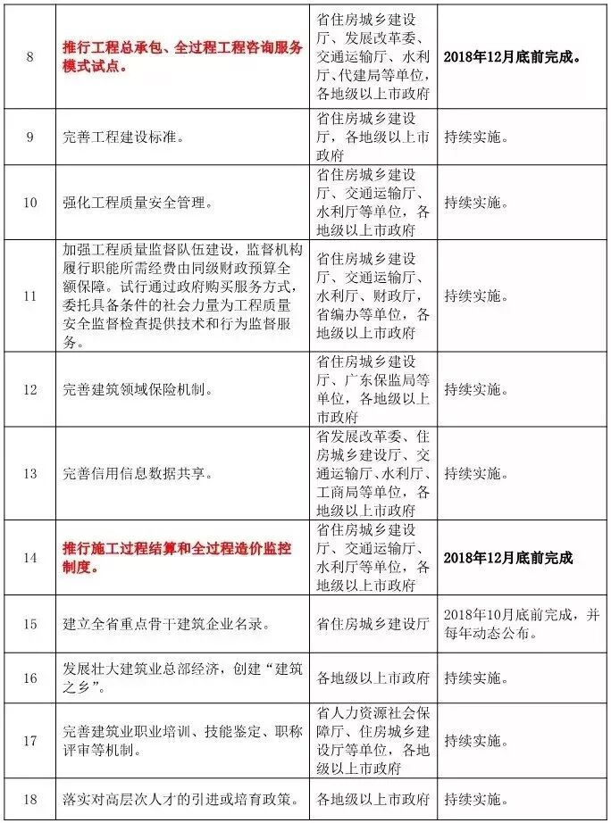 一、提升建筑业服务水平。进一步优化资质资格管理,依法按程序委托、下放部分省级资质审批事项。深化移动客户端在资质资格审批“一站式、一网式”服务上的应用,实现“最多跑一次”的目标。优化工程建设项目审批流程,对工程规划、抗震设防、初步设计、人防、消防、防雷、水土保持等审查验收事项,推行联合审查和验收。强化个人执业资格管理,加大职业责任追究力度;推动发展个人执业事务所和建立个人执业保险制度。