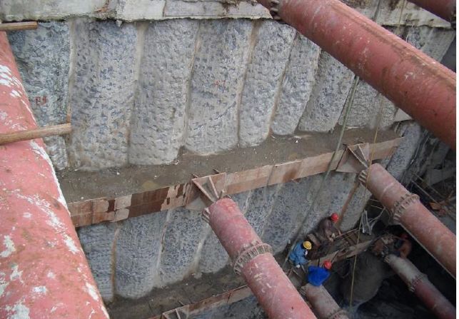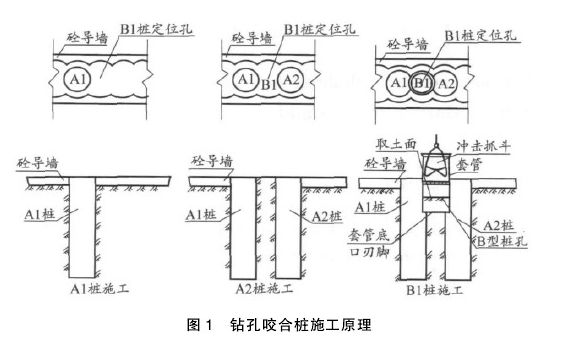 钻孔咬合事故桩的处理措施:在咬合桩施工过程中,有可能因素桩超缓凝混凝土的质量不稳定出现早凝或设备故障等原因使施工未能在正常的时间内施工完毕,从而形成事故桩。事故桩的处理主要分以下几种情况:(1)平移桩位单侧咬合。B1桩切割咬合施工时,A1桩的混凝土已经凝固,使钻机不能按正常施工条件切割咬合A1、A2桩完成B1桩。在这种情况下,可向A2桩方向平移B1桩桩位,使钻机单侧切割A2桩,以后在A1与B1桩外侧另增加一根旋喷桩作为过渡处理。(2)用后压浆技术,旋喷补强技术等法处理排桩之间的缺陷是十分有效的方法。