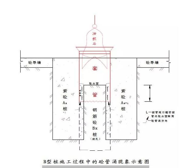 克服桩内“混凝土管涌”在A桩切割两侧素砼桩成孔过程中,由于B桩混凝土尚未凝固,还处于流塑状态,因此B桩混凝土可能从两桩相交处涌入A桩孔内,称为“混凝土管涌”。克服“混凝土管涌”主要采取以下措施: