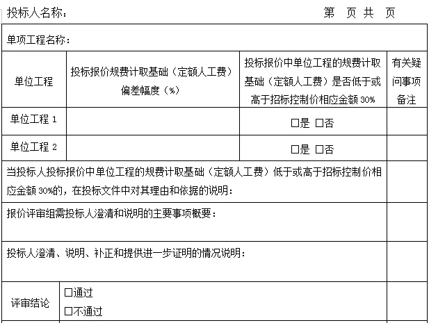 对按本款第1项规定评审通过的投标人投标报价中的规费计取基础(定额人工费)评审,投标报价中单位工程的定额人工费低于或高于招标控制价相应金额30%的,报价评审组应对其投标报价中规费计取基础的合规性、合理性进行分析,并可根据分析情况和评审需要向投标人提出询问。