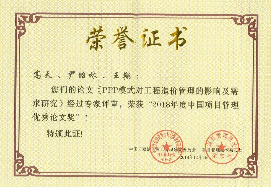 由尹贻林教授指导,王翔博士和高天共同完成的《PPP模式对工程造价管理的需求及影响研究》一文经过层层选拔,以总评第一名的成绩斩获项目管理优秀论文奖。硕士研究生高天代表尹塾智库前往领奖。