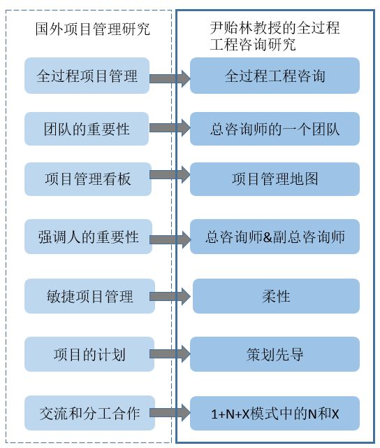 本次论坛国外嘉宾的演讲内容与尹老师的全过程工程咨询 “三个一”的思想基本一致,即,一个人是一个总咨询师,一个模式策划、管控、增值三位一体的全资模式,一条路径就是“1+N+X”,对比如下: