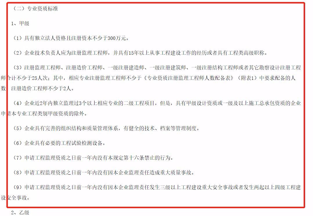 编者注:根据《通知》要求,甲级注册人员要求按乙级标准核定,例如:房屋建筑工程监理甲级资质的房屋建筑工程注册监理工程师人数要求由15人调整为10人。