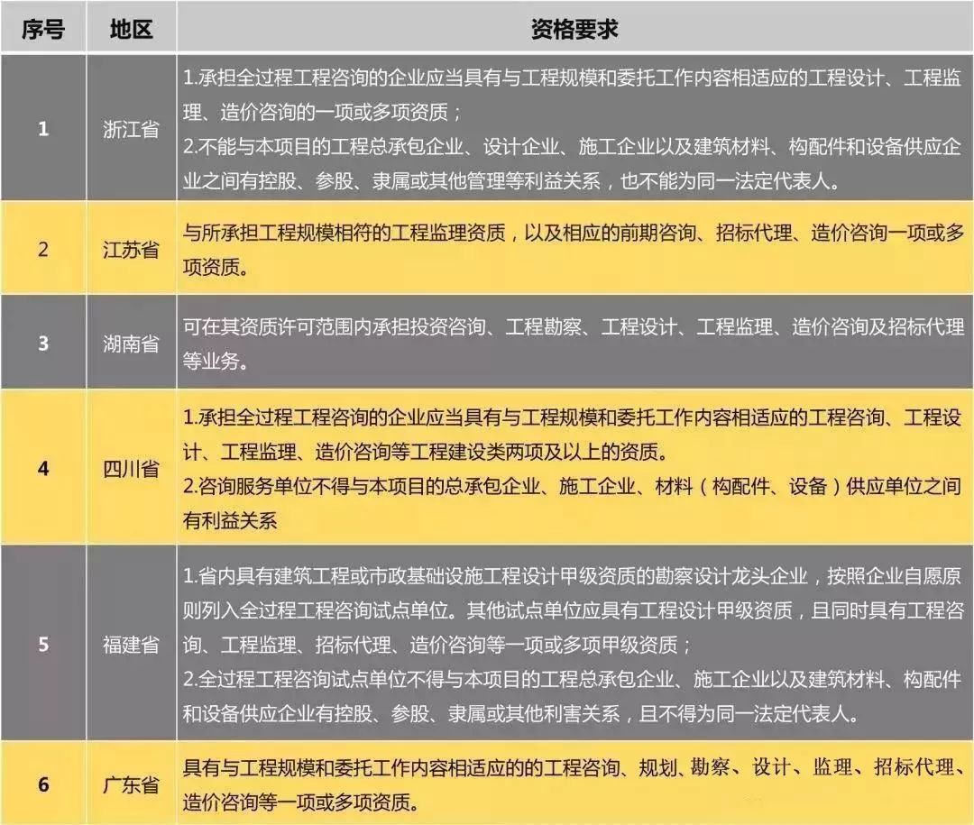 福建省要求“省内具有建筑工程或市政基础设施工程设计甲级资质的勘察设计龙头企业,按照企业自愿原则列入全过程工程咨询试点单位。其他试点单位应具有工程设计甲级资质,且同时具有工程咨询、工程监理、招标代理、造价咨询等一项或多项甲级资质”。