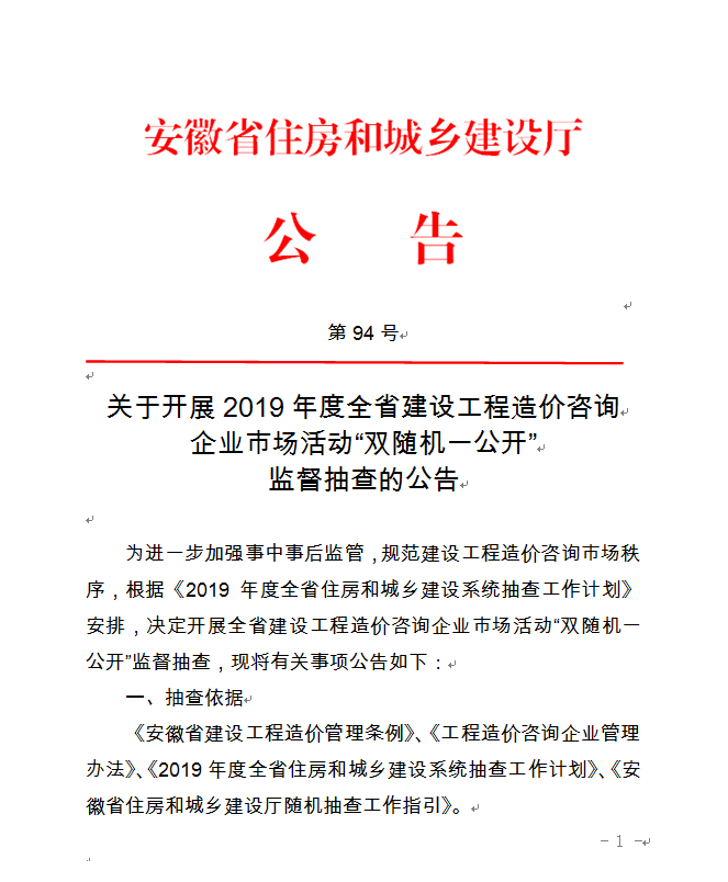 2019年度全省建设工程造价咨询企业市场活动“双随机一公开”监督抽查的公告