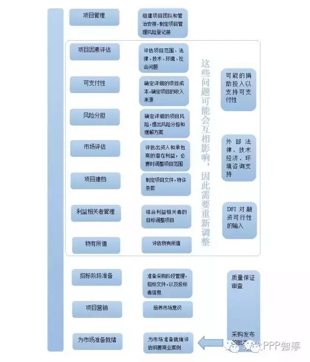 PPP项目经过最初的项目评估和选择的确定,焦点就转业到为从业市场所做的项目准备了。这个时期的项目准备阶段有两个主要方面。首先是确保政府部门充分准备,并组织管理过程中的活动。这些活动很可能包括更多地聘请外部顾问和审议预算的工作经费。其次是完成整个项目评估的并行活动,以确保项目基于健全的基础上开发。这个阶段的活动要求政府部门采取以下措施。