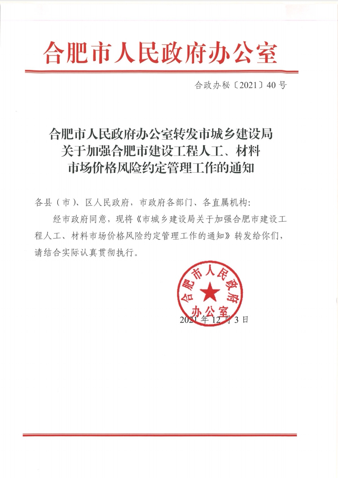 为了维护建设工程发承包双方的合法权益,合理分摊人工、材料价格波动的市场风险,保证工程质量安全和正常实施。根据《建筑工程施工发包与承包计价管理办法》(住房城乡建设部第16号令)、《建设工程工程量清单计价规范》(GB50500-2013)和安徽省住房和城乡建设厅《关于加强建筑工程材料价格风险控制的指导意见》(建市函〔2021〕507号)及《关于规范我省建设工程人工价格信息发布工作的通知》(建标〔2021〕46号)的有关要求,结合我市实际,现就加强建设工程交易过程中人工、材料市场价格风险约定管理工作通知如下: