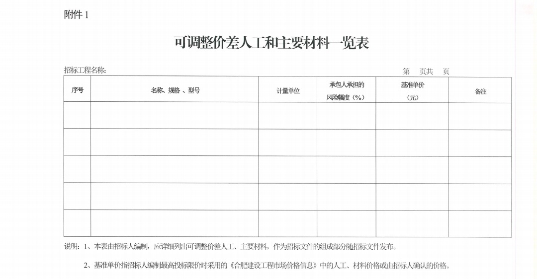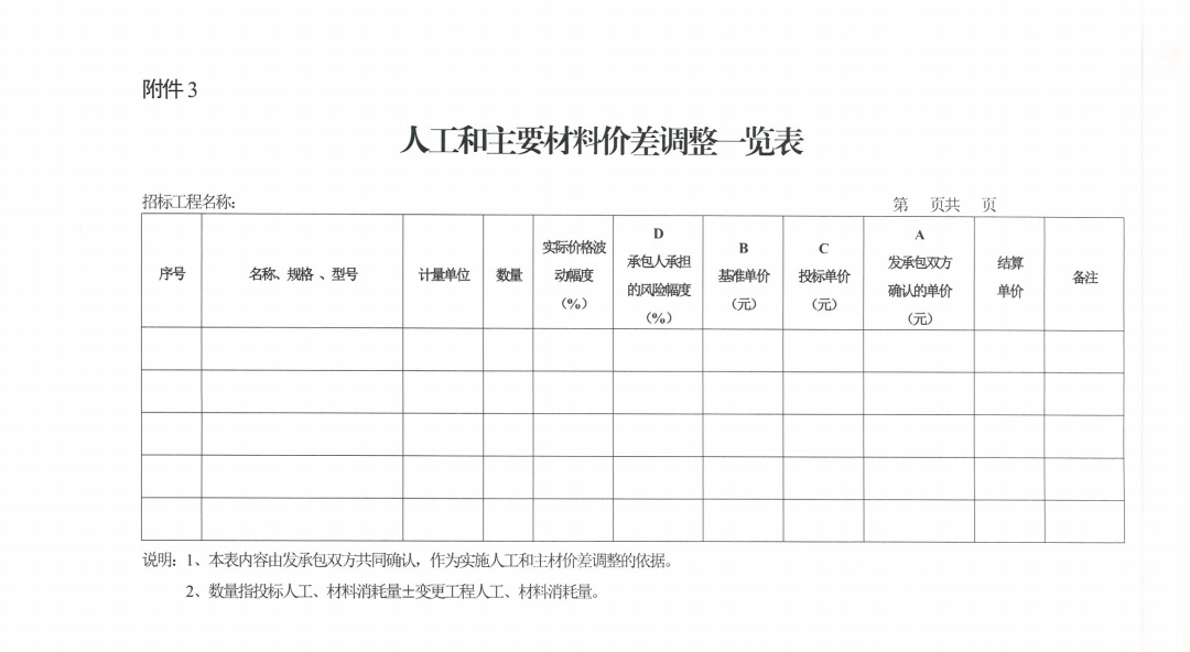 3、招标人(发包人)应将确定为可调整价差的人工、材料的名称、规格、型号、计量单位、承包人承担的风险幅度、基准单价单列清单(见附表1),随招标文件发布。招标过程中,投标人对可调整价差的人工、材料以上情况有疑问或要求澄清的,可以书面形式向招标人提出。
