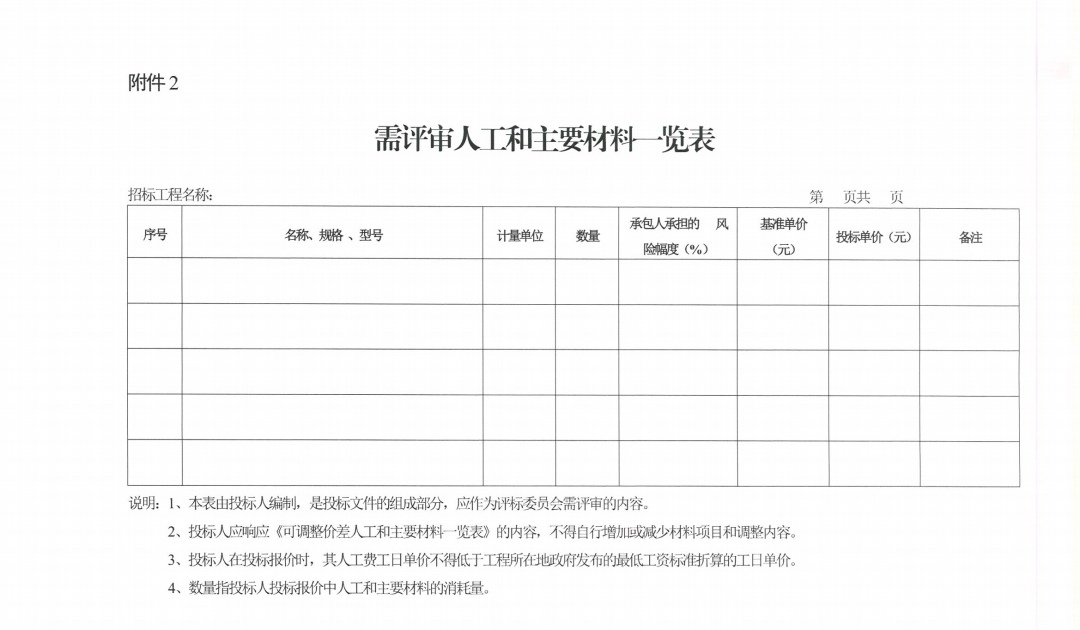 投标人(承包人)应响应招标文件,将可调整价差的人工、材料的名称、规格、型号、计量单位、承包人承担的风险幅度、材料数量(投标文件中材料消耗量)、基准单价、投标单价单列清单(见附表2),随投标文件提交,作为需评审内容。