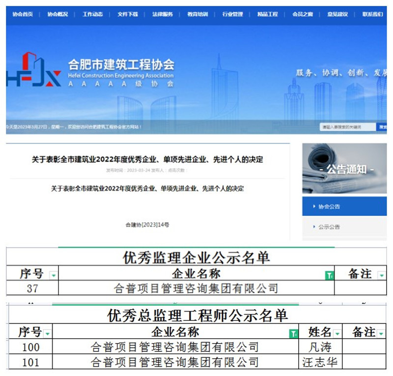 24日,合肥市建筑工程协会官网下发了关于表彰全市建筑业2022年度优秀企业、单项先进企业、先进个人的决定。集团公司荣获“优秀监理企业”称号,汪志华、凡涛荣获“优秀总监理工程师”称号。