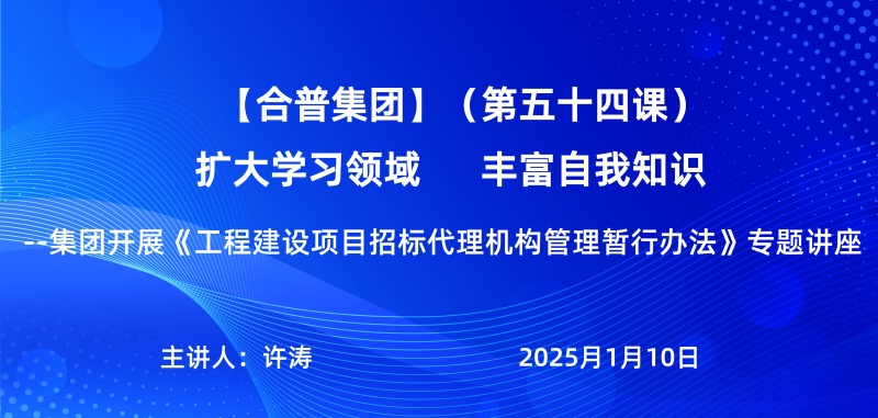 1月10日,合普课堂第五十四期由招标部许涛主讲,围绕《工程建设项目招标代理机构管理暂行办法》进行了专题讲解。此次课程重点解读了该办法对招标代理机构及其从业人员的管理要求,旨在帮助企业进一步规范招标代理行为、提升招标采购工作的合规性与专业性。