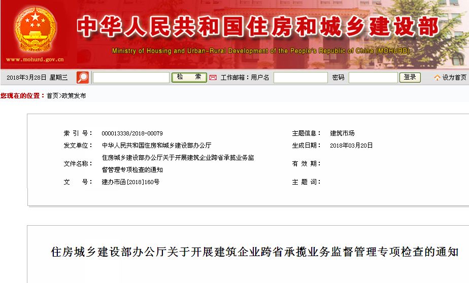 2018年3月27日住建部官网发布《住房城乡建设部建筑市场监管司2018年工作要点的通知》,明确提出:2018年重点对企业反映强烈的地区壁垒问题进行督查,严厉查处设置歧视性限制条件或隐性障碍等行为!