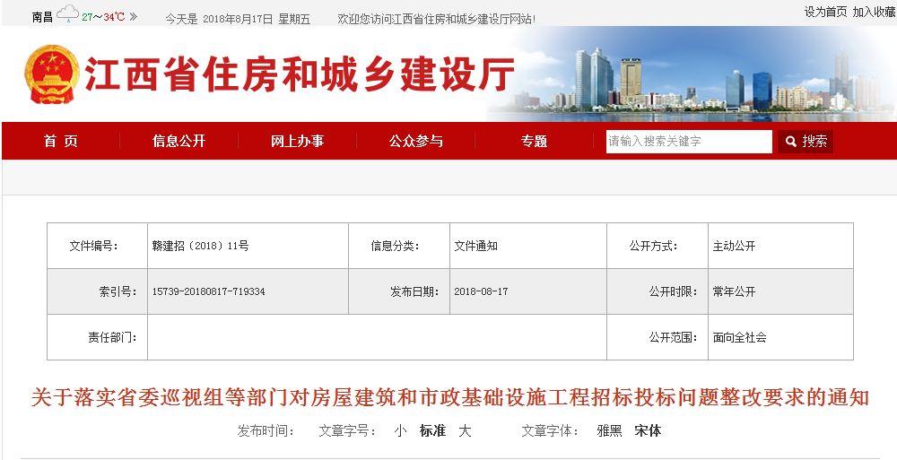 为贯彻落实省委巡视组公共资源交易领域巡视问题整改要求和省委主要领导在《江西省营商环境评估报告》上的批示精神,进一步落实《省人民政府办公厅关于促进建筑业持续健康发展的实施意见》(赣府厅发〔2017〕93号),解决建设工程招投标过程中存在的突出问题。经研究,现将有关事项通知如下: