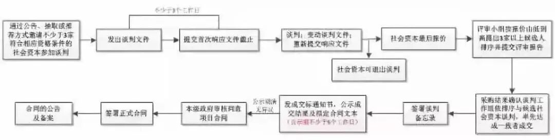 根据《政府采购法》、《政府采购法实施条例》、113号文、《政府采购非招标采购方式管理办法》和《PPP项目采购办法》等规定,通过竞争性谈判方式采购PPP项目的流程如下: