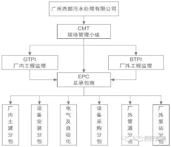 为了分摊项目风险,西朗项目公司通过招标寻找工程承包商,而且为了避免设计、采购和施工分别承包可能出现的衔接不清、责任难分的弊端。西朗项目采用EPC合同的形式进行。由国际邀请招标中标的EPC承包商香港亿辉工程公司以交钥匙的项目总承包方式对广州西朗污水处理厂、截污干管及泵站系统进行设计、采购和建设,以确保该项目以约定的总承包价并在规定的期限内完成,确保向业主交付符合EPC合同规定的基本处理量的处理能力并达到规定的出水水质标准的项目。